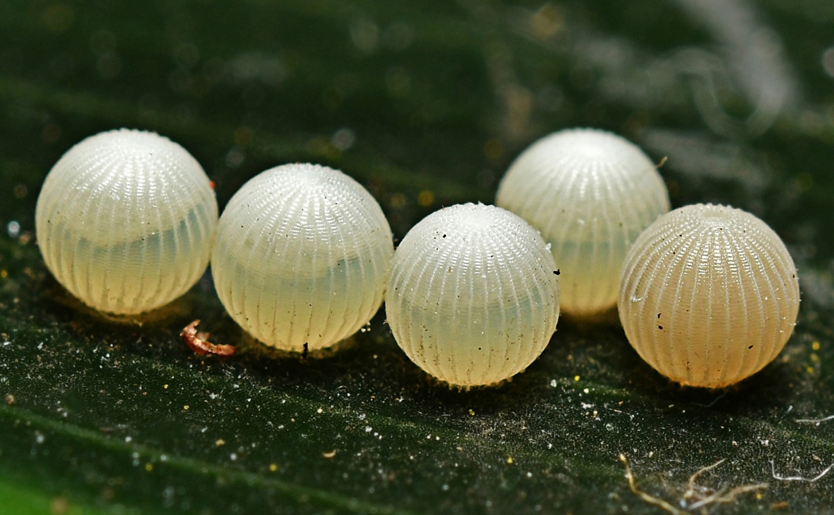 Jajeczka egzotycznego gt. motyla złożone na liściu bananowca