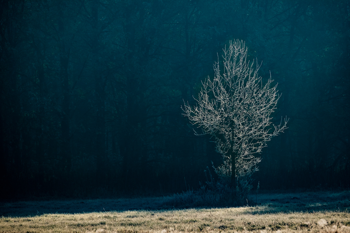 Oszronione drzewko w promieniach porannego słońca. Ostatnie ładne, jesienne poranki na Mazowszu.