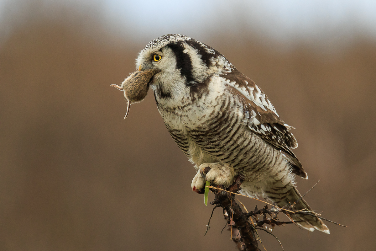 Zdjęcie sowy jarzębatej po udanym polowaniu. Podlasie 2022.