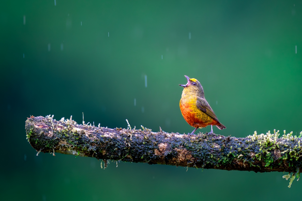 Organka zielonkawa (Euphonia gouldi) to mały, bardzo ruchliwy ptaszek z rodziny zięb. Zamieszkuje głównie w wilgotnych lasach i na przyległych do nich krzaczastych polanach na obszarze rozciągającym się od południowego Meksyku po Panamę. Widoczny na zdjęciu samiec, zamarł na moment bez ruchu z szeroko rozdziawionym dziobem. Co ciekawe nie wydawał żadnego dźwięku i trwał w tej pozie przez kilka sekund jakby chciał złapać w swój dziób spadające krople deszczu. Boca Tapada, Kostaryka
