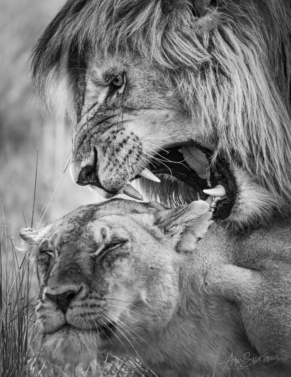Miłosne ugryzienie Zakochana para lwów w Maasai Mara w Kenii Parametry techniczne: Aparat: NIKON CORPORATION; Model: NIKON D5; Przysłona: f/6,3; Czas ekspozycji: 1/1000 s; ISO: 1600; Ogniskowa: 490 mm; © fot. Artur Stankiewicz data dodania: 29-05-2021