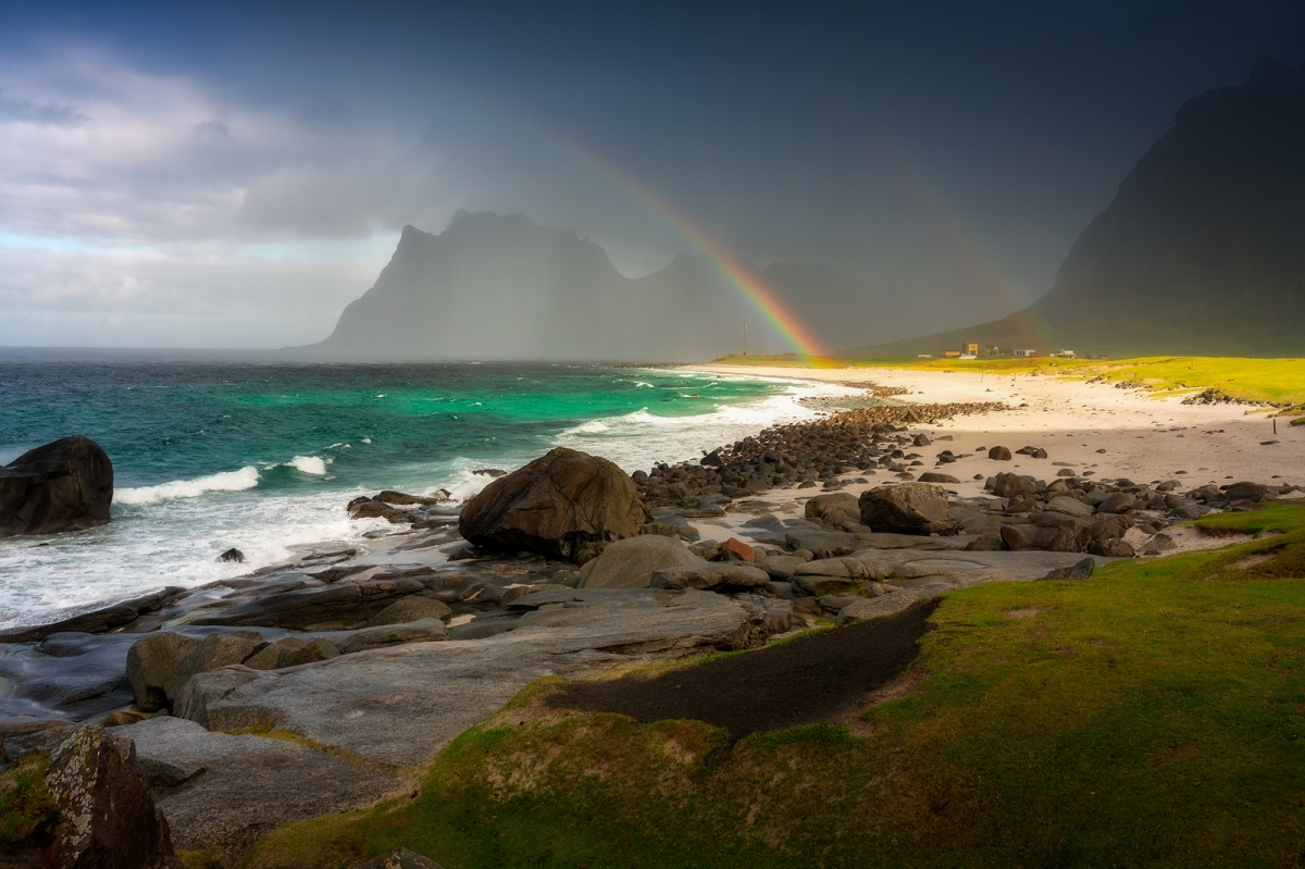 testowe Tęcza na Lofotach Norwegia, Lofoty i plaża Uttakleiv. Spektakularne warunki, co kilka minut ściana deszczu powodowała, że cały sprzęt foto wręcz pływał… jednak pomiędzy ulewami, jak już udało się wytrzeć obiektyw, działa się magia. © fot. Jakub Perlikowskidata dodania: 28-09-2023
