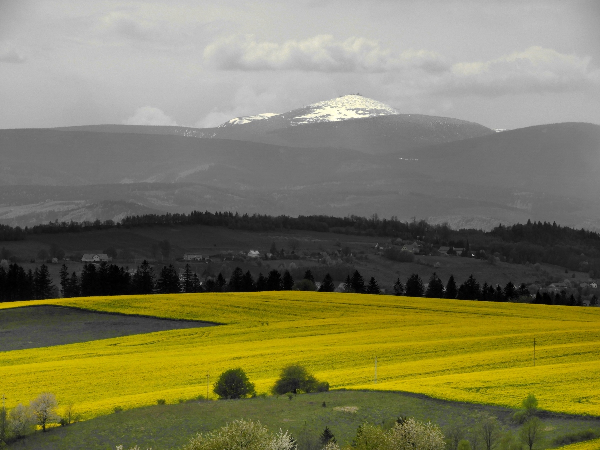 W oddali Śnieżka, na pierwszym planie łany rzepaku, zdjęcie robione w trybie selektywnym.