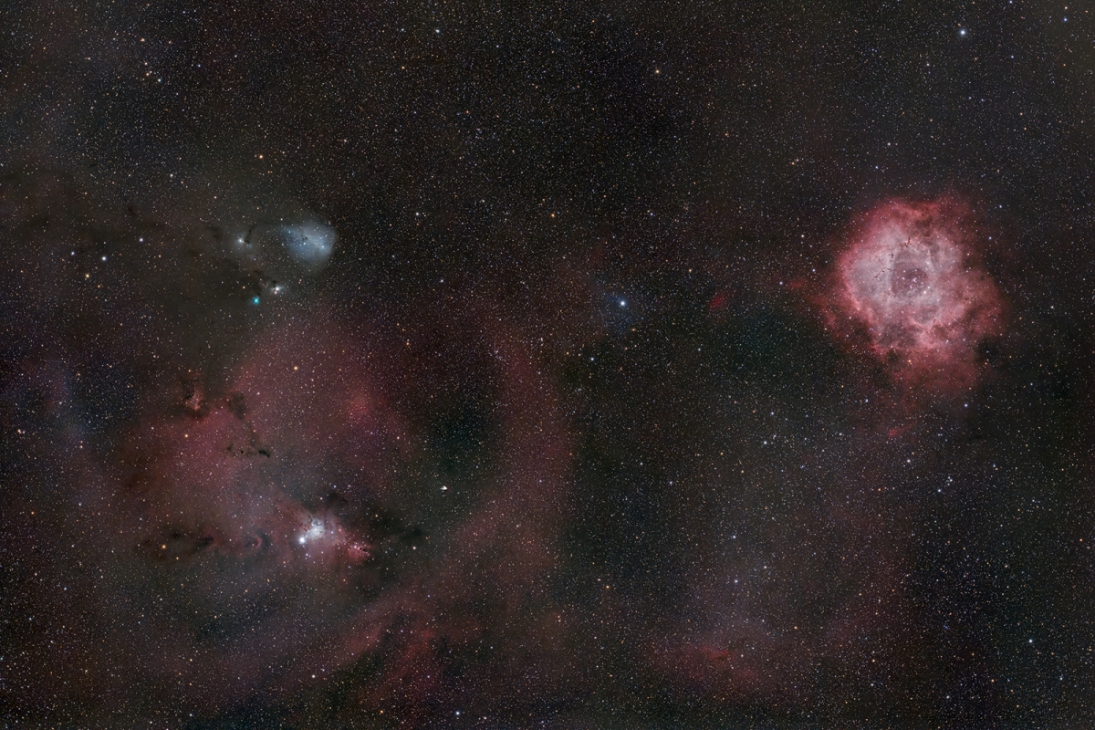Z Wizytą w Kosmosie Szeroka okolica prezentowanej niedawno przeze mnie Mgławicy Rozeta w Konstelacji Jednorożca, w kolorach w zasadzie naturalnych. "W zasadzie" gdyż jest tu jeszcze podczerwień, no i nie ma jak tego naocznie potwierdzić, ponieważ receptory koloru w naszych oczach nie działają przy tak słabym świetle. Dopiero długie naświetlanie pozwala wydobyć kolory. Parametry techniczne: Canon EOS 6D mod + Askar 180, filtr ZWO UV/IR cut, prowadzenie Ioptron Sky Guider Pro, 174 x 60s. Myślenice, Polska, styczeń 2025. © fot. Michał Kasperczyk data dodania: 05-02-2025