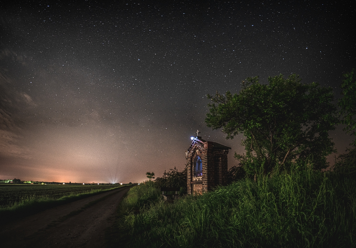 Kapliczka w polu Kapliczka Hoffmanna na polach niedaleko Przysieczy (woj. opolskie). Oddalona niecały kilometr autostrada nadal silnie doświetla teren. Z drugiej strony małe lampki w kapliczce i na jej szczycie genialnie nadają klimatu Parametry techniczne: Aparat: RICOH IMAGING COMPANY, LTD.; Model: PENTAX K-1; Przysłona: f/2,8; Czas ekspozycji: 1/0.1 s; ISO: 1600; Ogniskowa: 15 mm; © fot. Henryk Niestrój data dodania: 27-05-2023