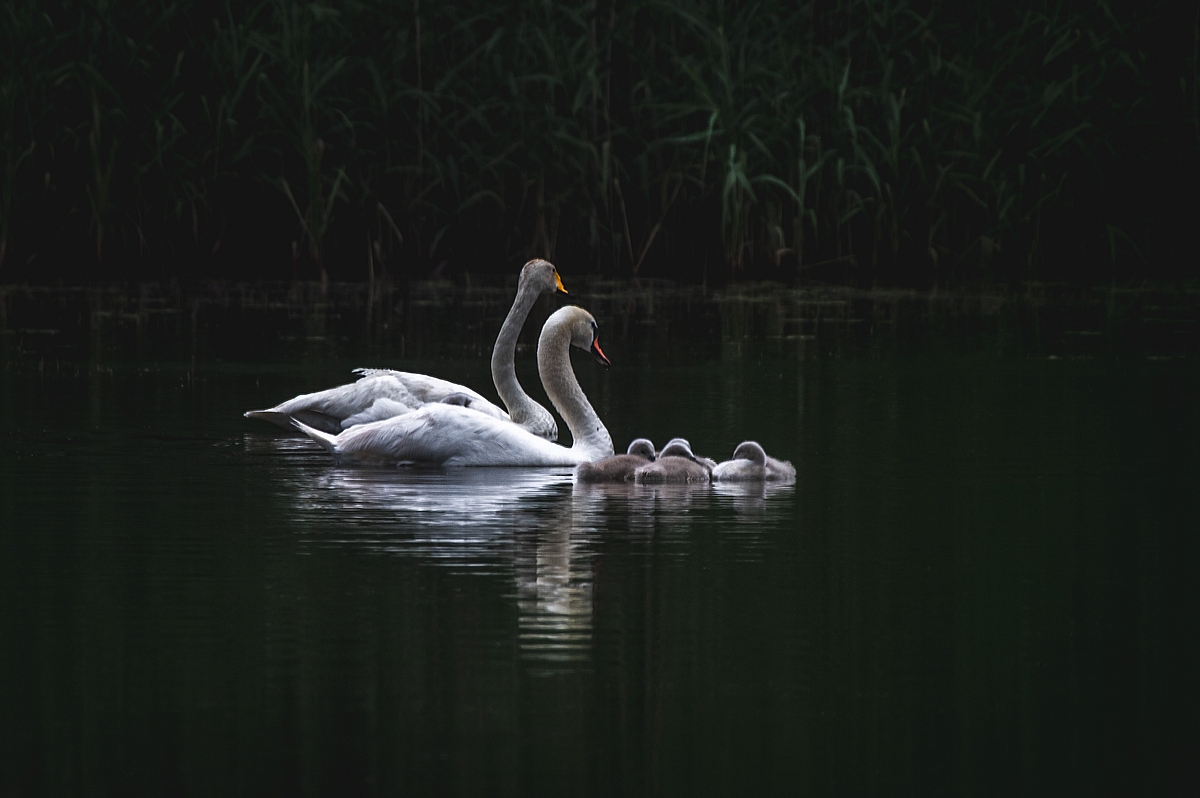 łabędź niemy i łabędź krzykliwy z młodymi