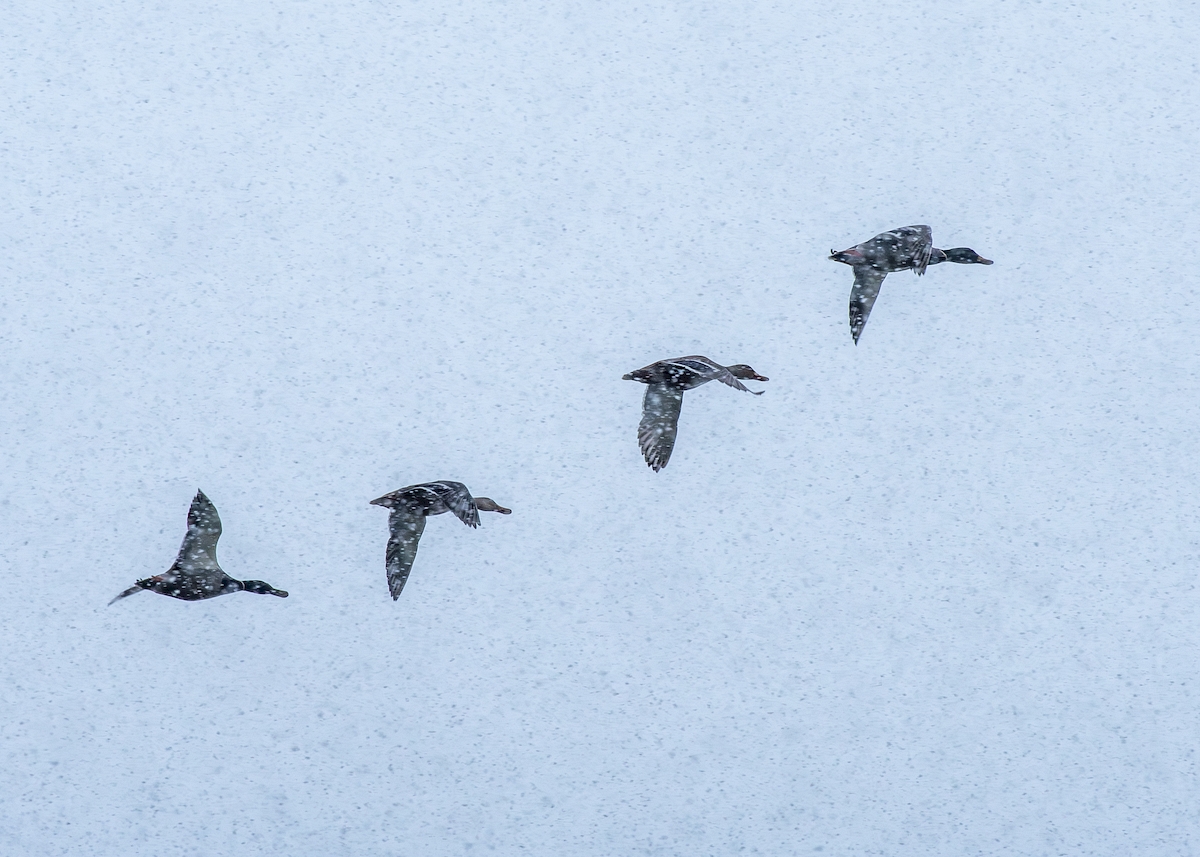 testowe lot w śnieżycy Dzikie kaczki między płatkami śniegu Parametry techniczne: Aparat: RICOH IMAGING COMPANY, LTD.; Model: PENTAX KP; Przysłona: f/7,1; Czas ekspozycji: 1/1000 s; ISO: 400; Ogniskowa: 450 mm; © fot. Henryk Niestrój data dodania: 25-11-2023