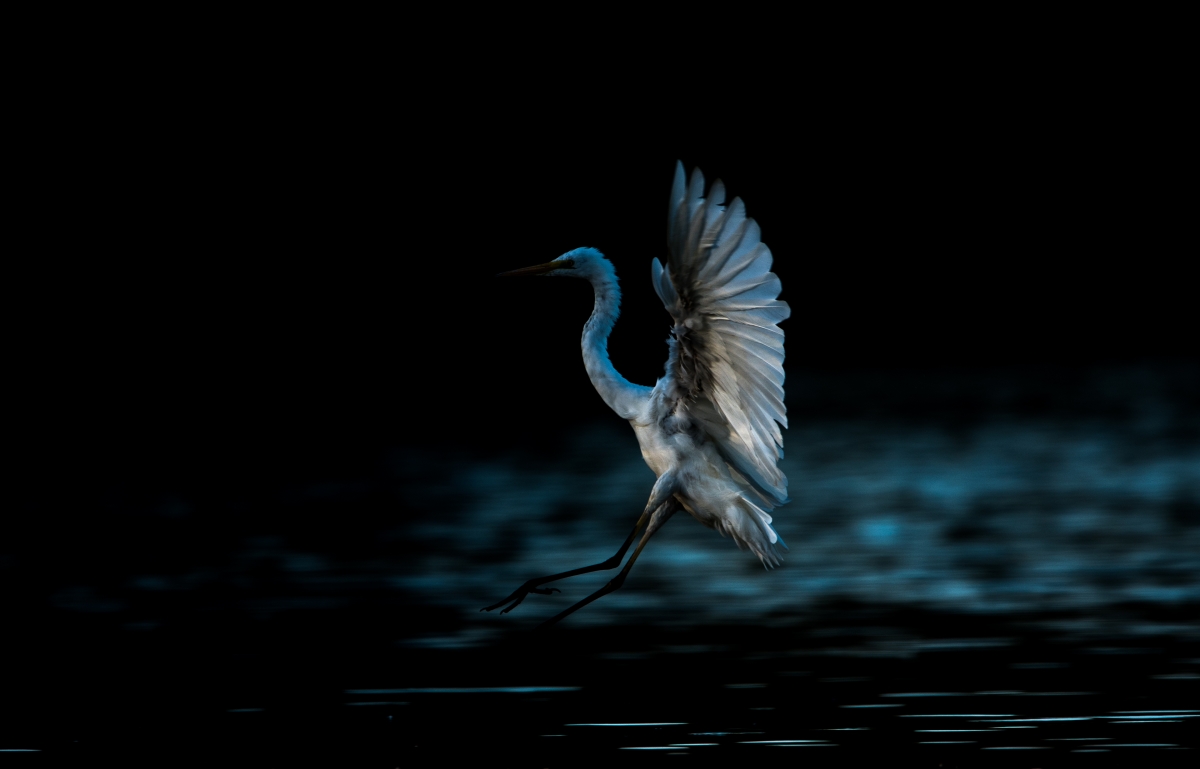 Zdjęcie lądującej czapli białej, zrobione na terenie rezerwatu Stawy Milickie.