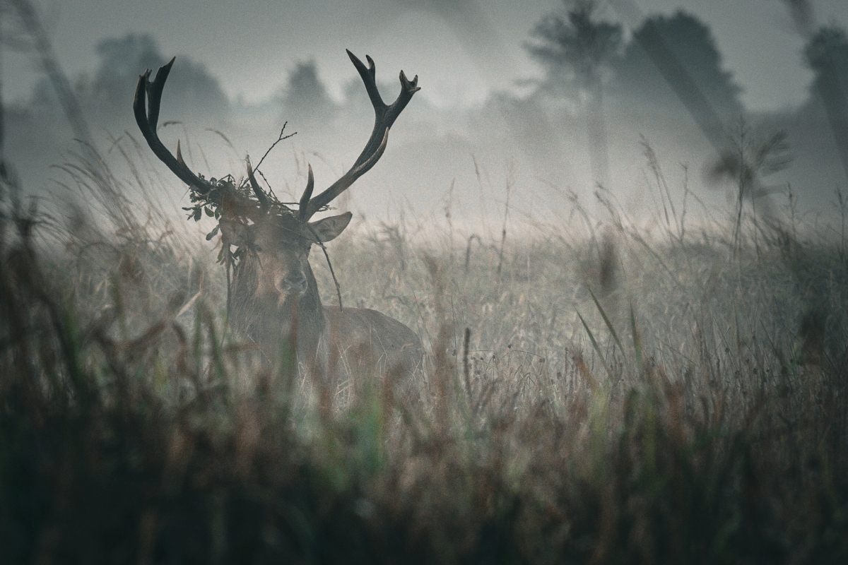 To było niesamowite spotkanie... Ponieważ nad łąką wisiała jeszcze mgła, jeleń nie rozpoznał ludzkich sylwetek i z zaciekawieniem podchodził coraz bliżej. Kiedy powstało to zdjęcie stał od nas (byłem na fotospacerze z kolegą Mariuszem Zielińskim, obejrzyjcie koniecznie jego zdjęcia publikowane iin tu, na łamach Foto-Kuriera) może ok 30 m. Samo patrzenie na takie zwierzę w jego środowisku to ogromna frajda a jeszcze zrobić mu zdjęcie... no bajka:-) W końcu jeleń wiedział już z kim ma do czynienia i uciekł. Może i dobrze bo mógł nas zaatakować:-) Tak, wiem że wyszło sporo ziarna bo to duuuży crop ale nie odszumiałem go w obawie o detale. W końcu lepiej mieć zdjęcie niż go nie mieć, prawda?:-)