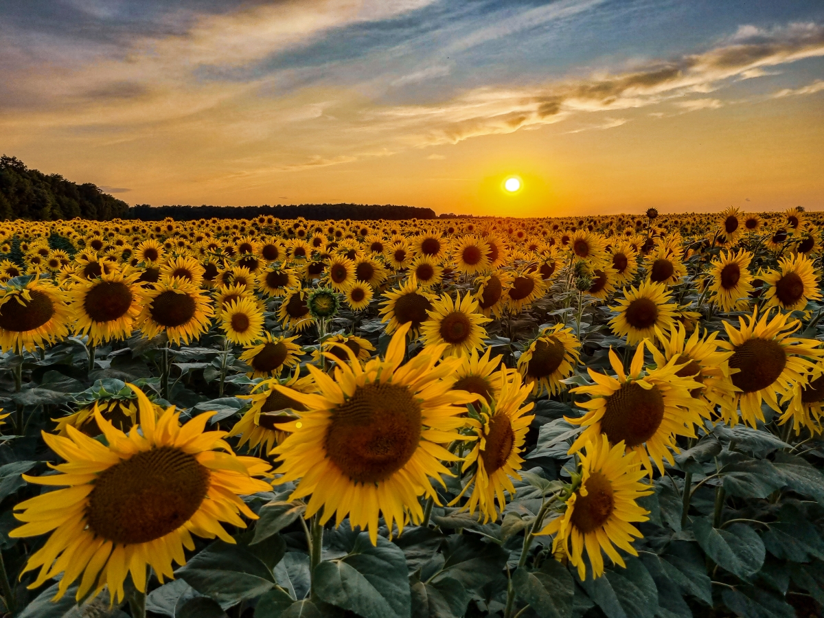 Zdjęcie przedstawia pole słoneczników o zachodzie słońca.