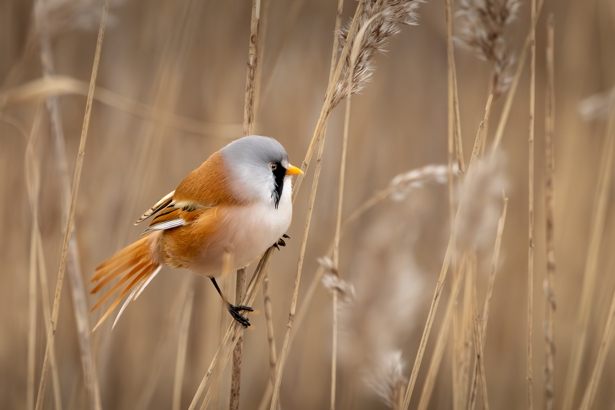 Samiec wąsatki Parametry techniczne: Aparat: Canon; Model: Canon EOS R6m2; Przysłona: f/11,0; Czas ekspozycji: 1/2000 s; ISO: 6400; Ogniskowa: 700 mm; © fot. Mariola Stańkowska data dodania: 03-03-2024
