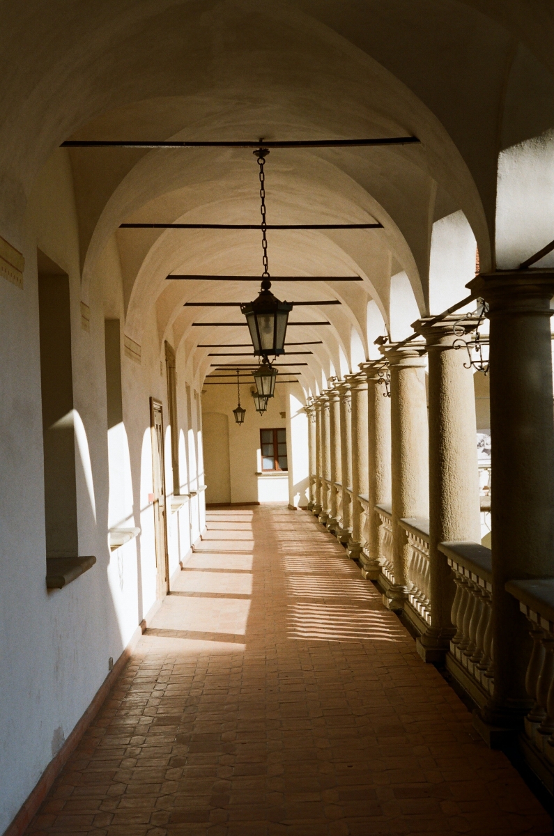 Zdjęcie zostało wykonane analogowo na zamku królewskim w Niepołomicach, przedstawia zamkowe krużganki.