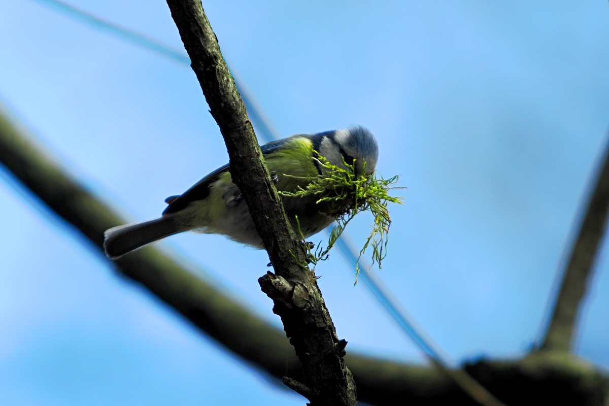 Modraszka z kępą mchu w dziobie w drodze do gniazda.
