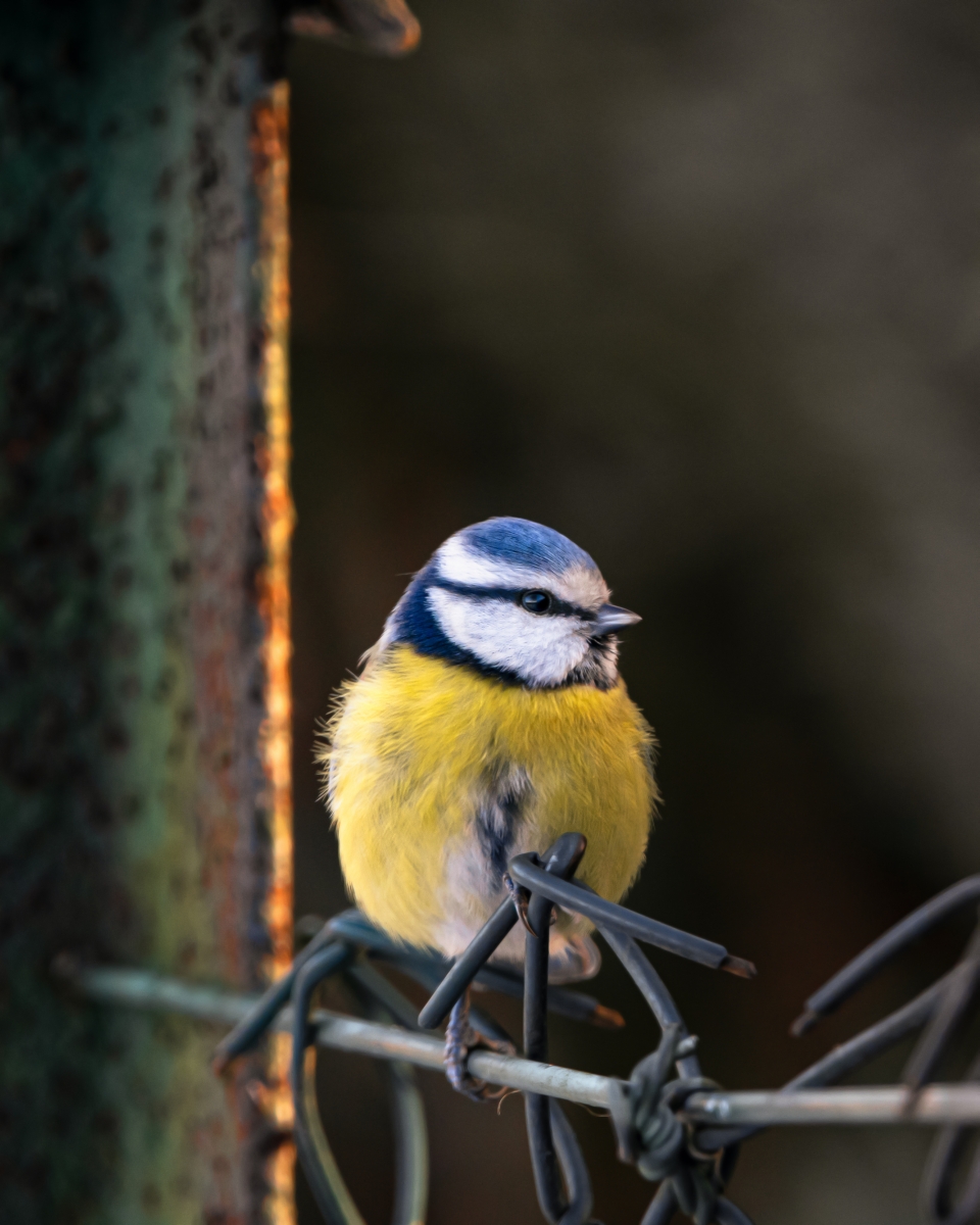 Sikorka modraszka na płocie z siatki
