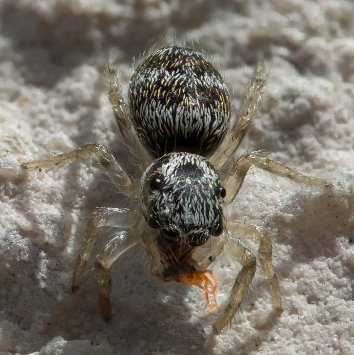 testowe Kokosanka Pająk (Araneae) z rodziny Skakunowatych (Salticidae) jakim jest "Skakun arlekinowy" (Salticus scenicus), okaz juwenilny ze zdobyczą - na dzień dzisiejszy najmniejszy pająk jakiego złapałem (+/- 3mm) Parametry techniczne: TOKINA AT-X PRO D MACRO 100M F/2.8 + Raynox DCR-250, stos obrazów 40 zdjęć Aparat: NIKON CORPORATION; Model: NIKON D7500; Przysłona: f/18,0; Czas ekspozycji: 1/500 s; ISO: 400; Ogniskowa: 100 mm; © fot. Kamil Górawski data dodania: 12-09-2024