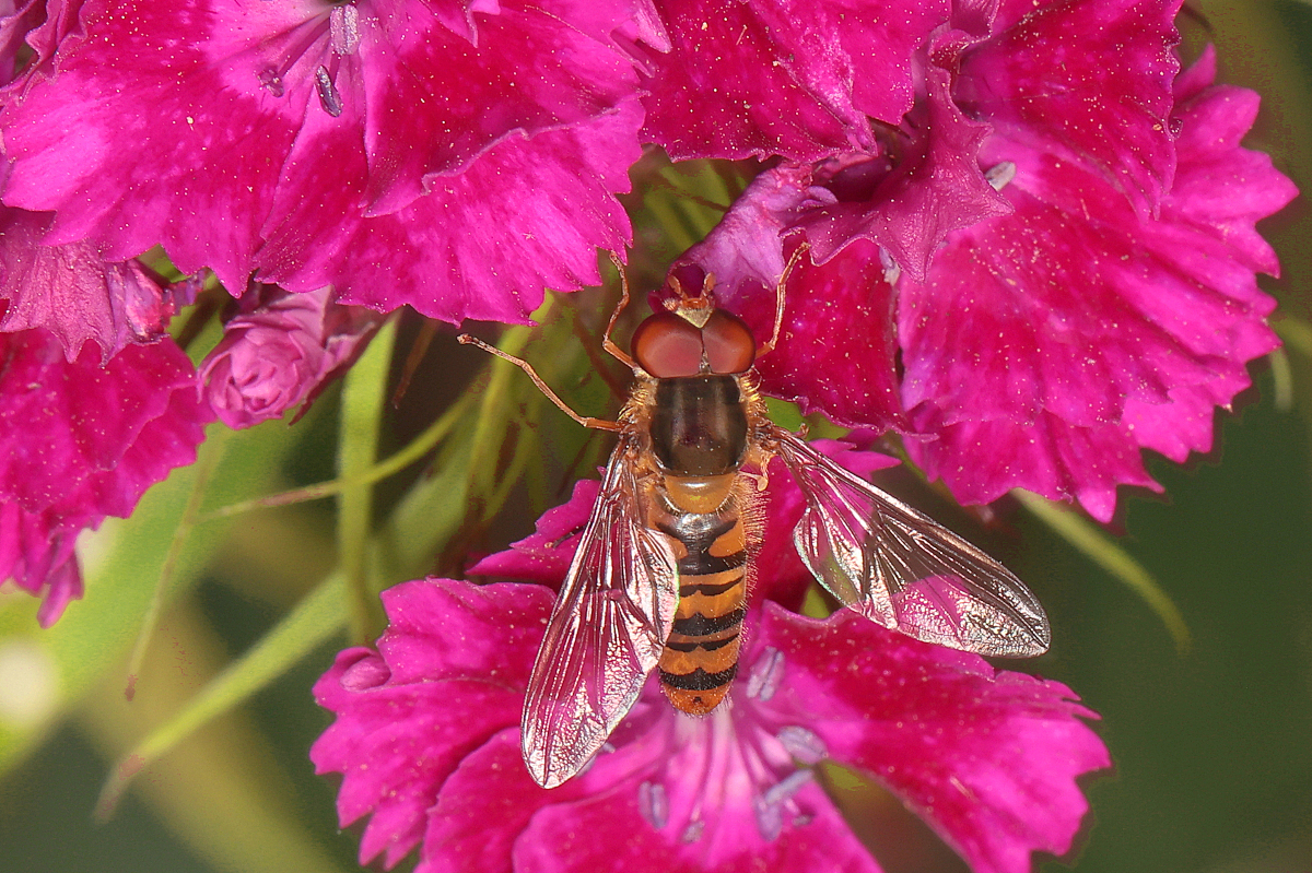 testowe Bzyg "Na zdjęciu widoczny jest bzyg prążkowany (Episyrphus balteatus), znany również jako bzyg marmoladowy". Parametry techniczne: Aparat: Canon; Model: Canon EOS R6; Przysłona: f/16,0; Czas ekspozycji: 1/60 s; ISO: 1000; Ogniskowa: 100 mm; © fot. MAREK SAS data dodania: 30-06-2025