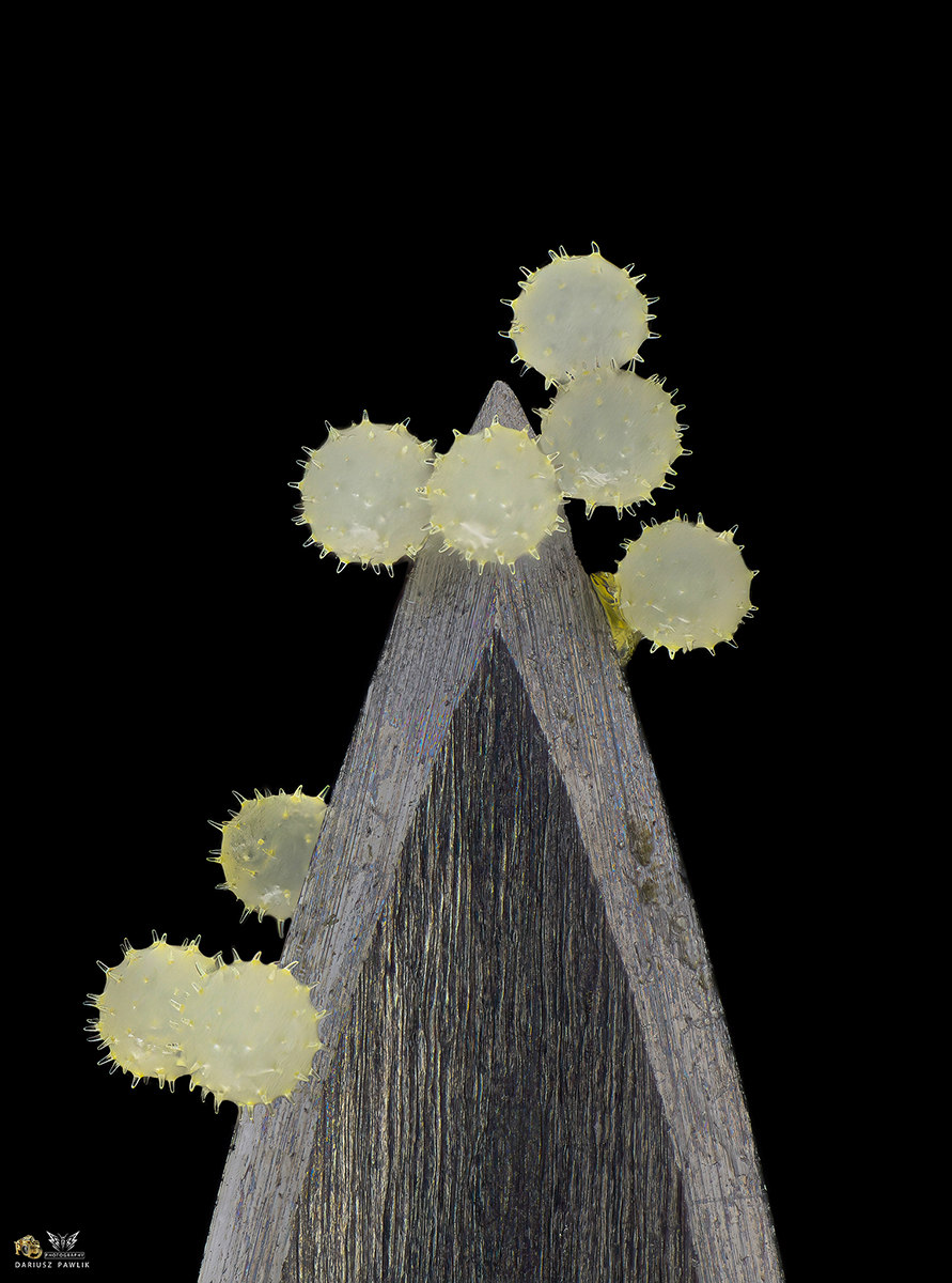 Pyłek kwiatowy na igle medycznej w powiększeniu około 10x