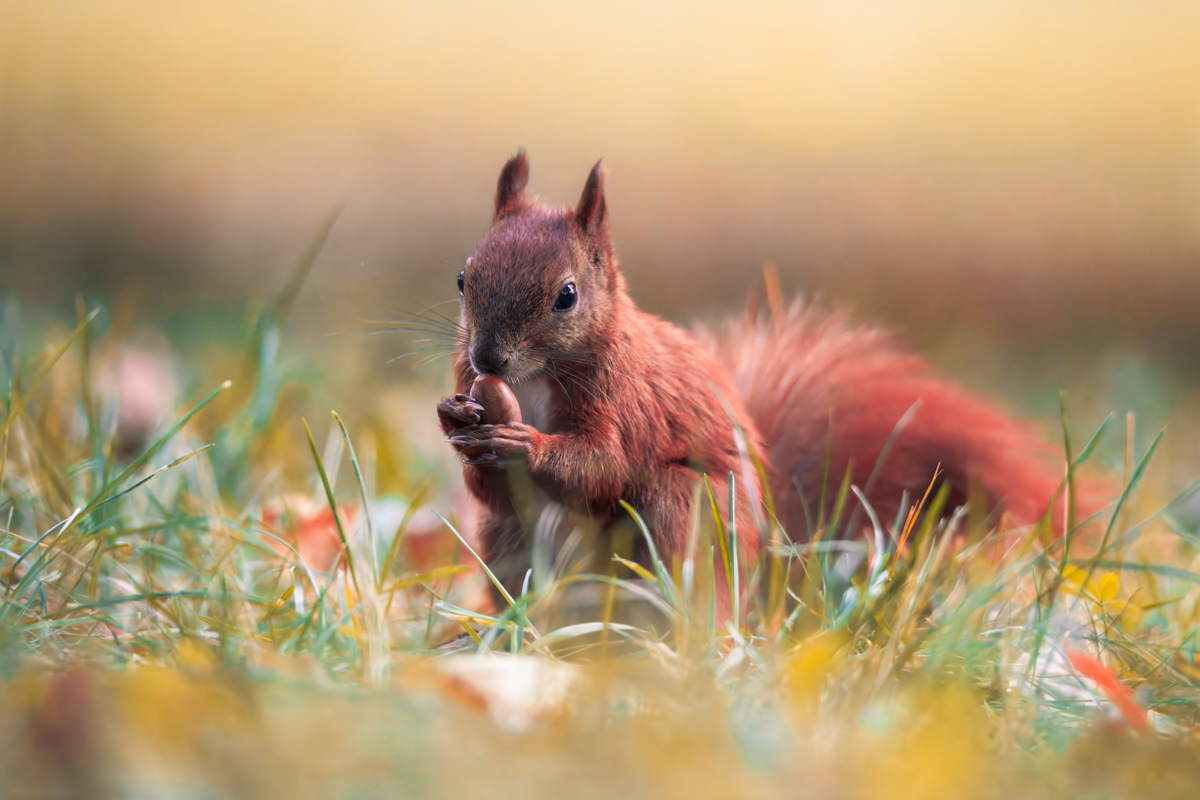 Jesienny skarb W zaciszu warszawskich Łazienek Królewskich, pośród jesiennych liści i historycznej scenerii, uchwycona została wiewiórka ruda w intymnej chwili - z żołędziem w łapkach, jakby na moment zapomniała o pośpiechu. Jej spojrzenie, pełne ciekawości i czujności, oddaje naturalną grację i urok miejskiej fauny. To nie tylko portret zwierzęcia, lecz subtelna opowieść o harmonii między przyrodą a przestrzenią kultury, o drobnych gestach życia, które dzieją się tuż obok nas. Parametry techniczne: Aparat: Canon EOS R8; obiektyw: Tamron 150-600 G2; przysłona: f/6.3; czas ekspozycji: 1/640 s; ISO: 10000; ogniskowa: 483 mm © fot. Jacek Zega data dodania: 10-10-2025
