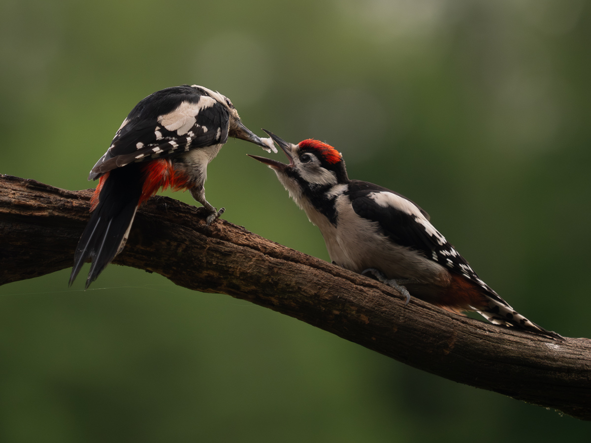 Dzięcioł duży, karmi małego