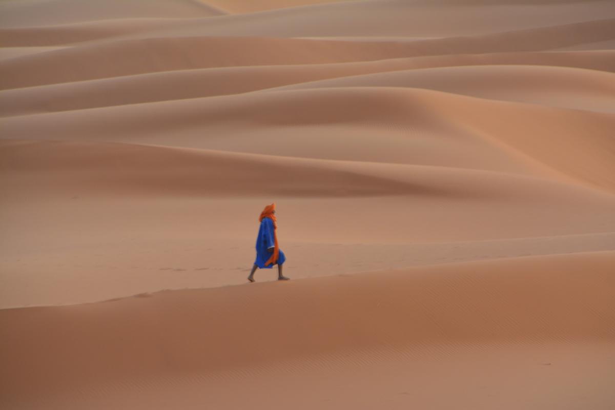 Podczas wycieczki na Saharę zauważyłem samotnego beduina wędrującego przez piaszczyste wydmy.