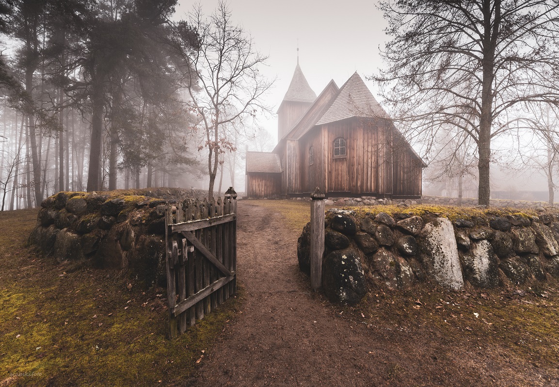 spacer we Wdzydzach Kiszewskich po najstarszym skansenie w Polsce w mglisty dzień to niesamowite doświadczenie, gęsta mgła i otoczenie starych zabudowań sprawiło że poczułem, jakbym cofnął się w czasie o kilka dekad, na fotografii jeden z wielu obiektów znajdujących się w skansenie, kościół pw. Św. Barbary przeniesiony do skansenu z miejscowości Swornegacie