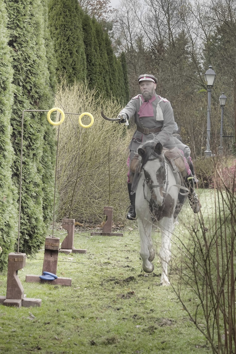 testowe Do celu Żołnierz ubrany w historyczny mundur galopując na koniu lekko pochyla się by dosięgnąć celu. Zawieszone kółka symbolizują ćwiczenia sprawności kawalerii a całość oddaje atmosferę wojskowego treningu. Parametry techniczne: Aparat: SONY; Model: DSC-RX10M4; Przysłona: f/6,3; Czas ekspozycji: 1/250 s; ISO: 1000; Ogniskowa: 62.4 mm; © fot. Jerzy Rydwański data dodania: 29-12-2025