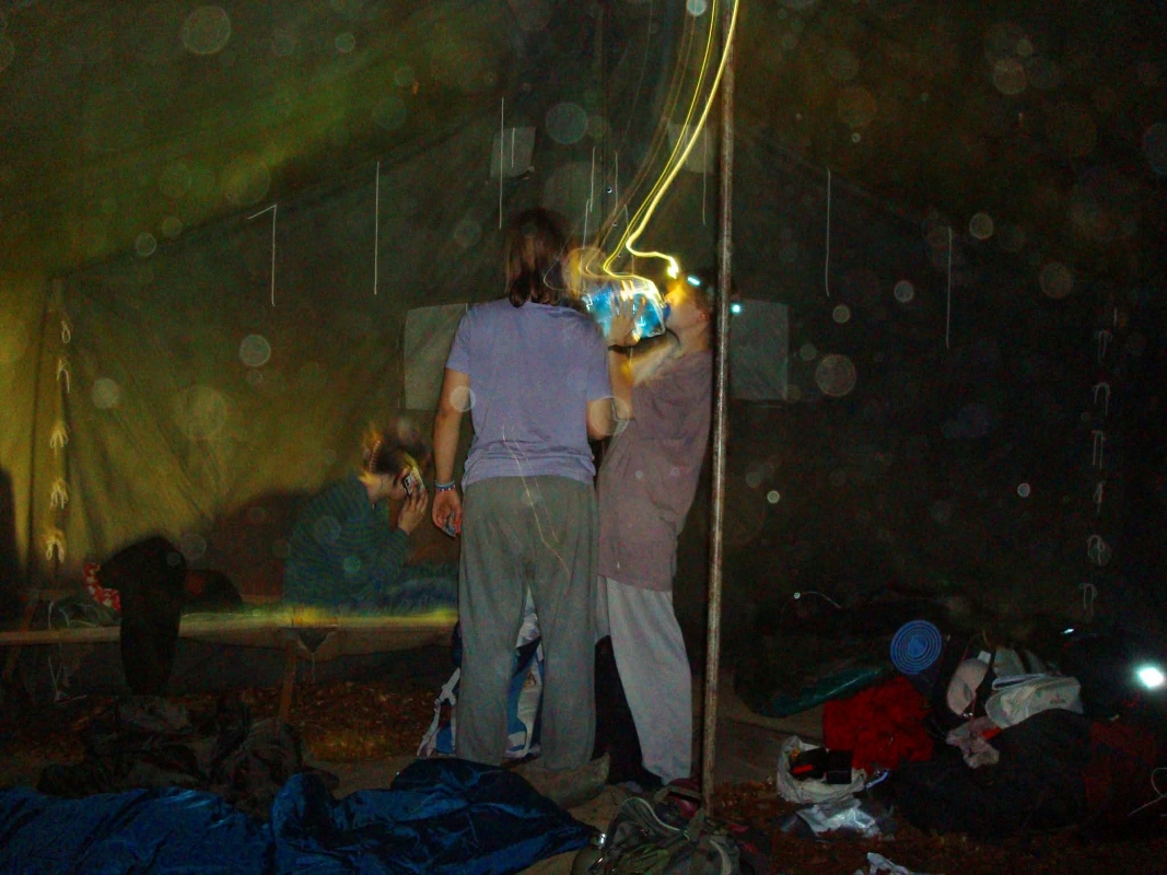Zdjęcie zrobione na obozie harcerskim podczas kwaterki. Wieczny bałagan, czołowka na głowie Zuzi, Nikola czekająca na baniak wody, rozstawiona kanadyjka dla Nadii w gipsie + kurz w powietrzu od suchej ziemi. Najlepsze wspomnienia! :)