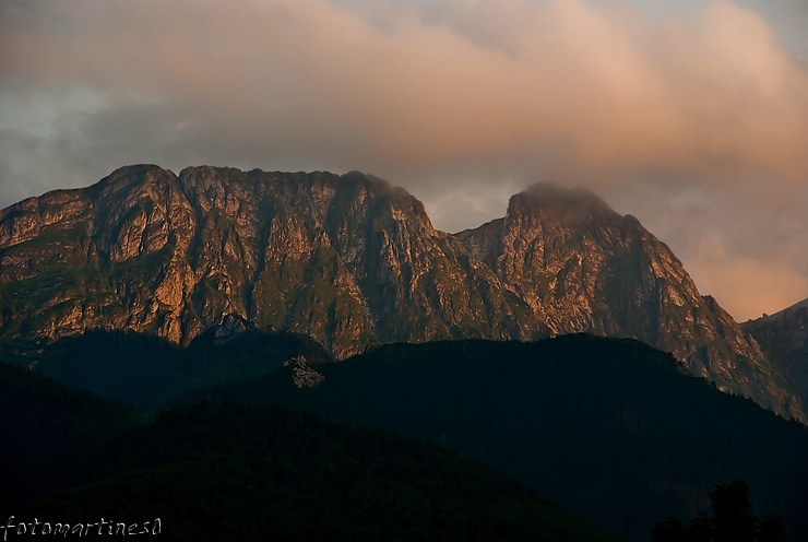 Giewont oświetlony promieniami zachodzącego słońca.