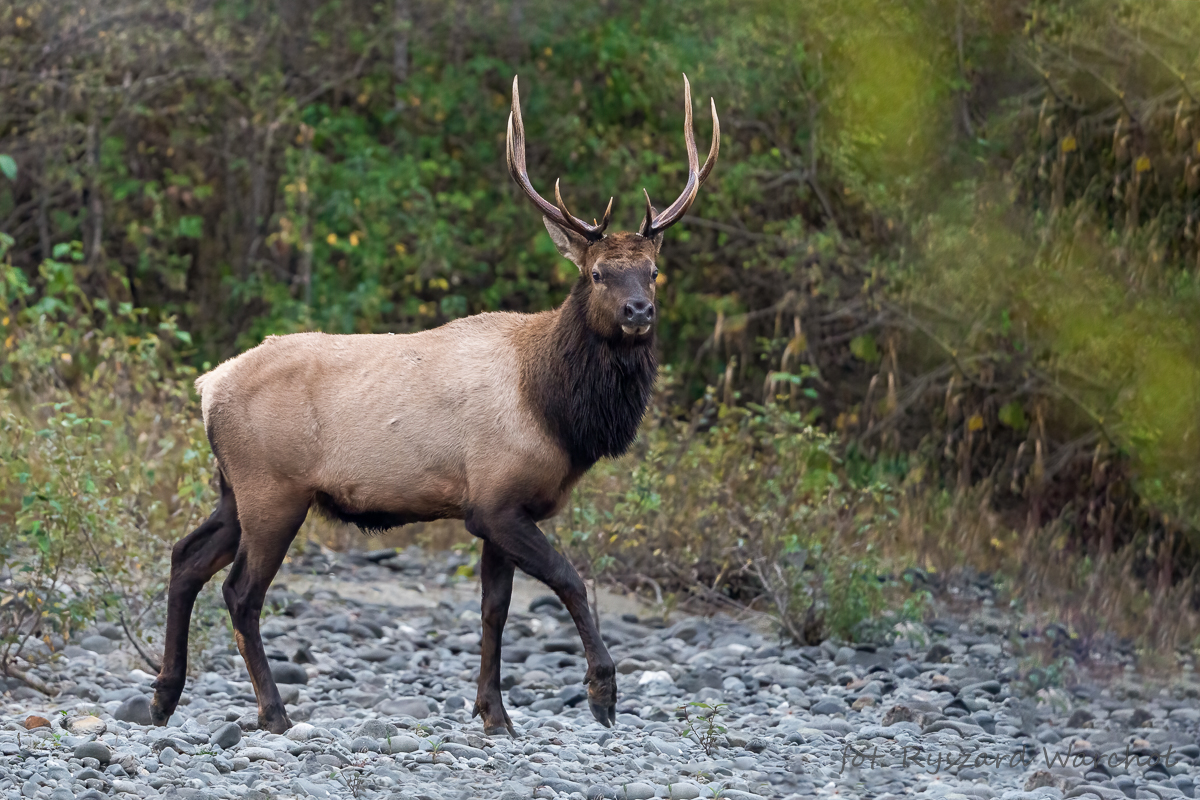 Przypadkowe spotkanie z Czarnobrodym To za czym u nas jeździłem i nie było mi dane, w Kanadzie się udało i zaowocowało tym zdjęciem. Wypatrzony z mostu podczas jazdy samochodem. Błyskawiczna decyzja, zawrotka, szybkie zejście w dół i po chwili już jestem nad wodą. Parę zdjęć i jedziemy dalej :-) Piękny i skryty - Wapiti Wapiti czyli jeleń kanadyjski uważany za symbol wdzięku i delikatności kojarzy się też z brutalnymi walki samców. Bywa że zwycięzca rozwścieczony odejściem pokonanego ściga go i zajadle atakuje. Mimo że są zwierzętami łownymi, cieszą się sympatią. Potrafią zadziwić odwagą i wytrzymałością oto cechy największego współczesnego jelenia - Wapiti. Zwierzę to, przez rdzennych Amerykanów traktowane było z szacunkiem, przez tysiące lat było źródłem wartościowego mięsa i skór. Wapiti znajduje się w godle Kolumbii Brytyjskiej. Vancouver Island, Kolumbia Brytyjska, Kanada