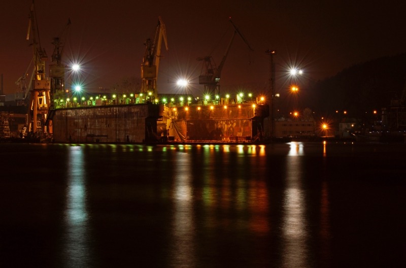 zdjęcie wykonane przy Kapitanacie Portu w Gdyni w porze wieczornej przedstawia dok remontowy