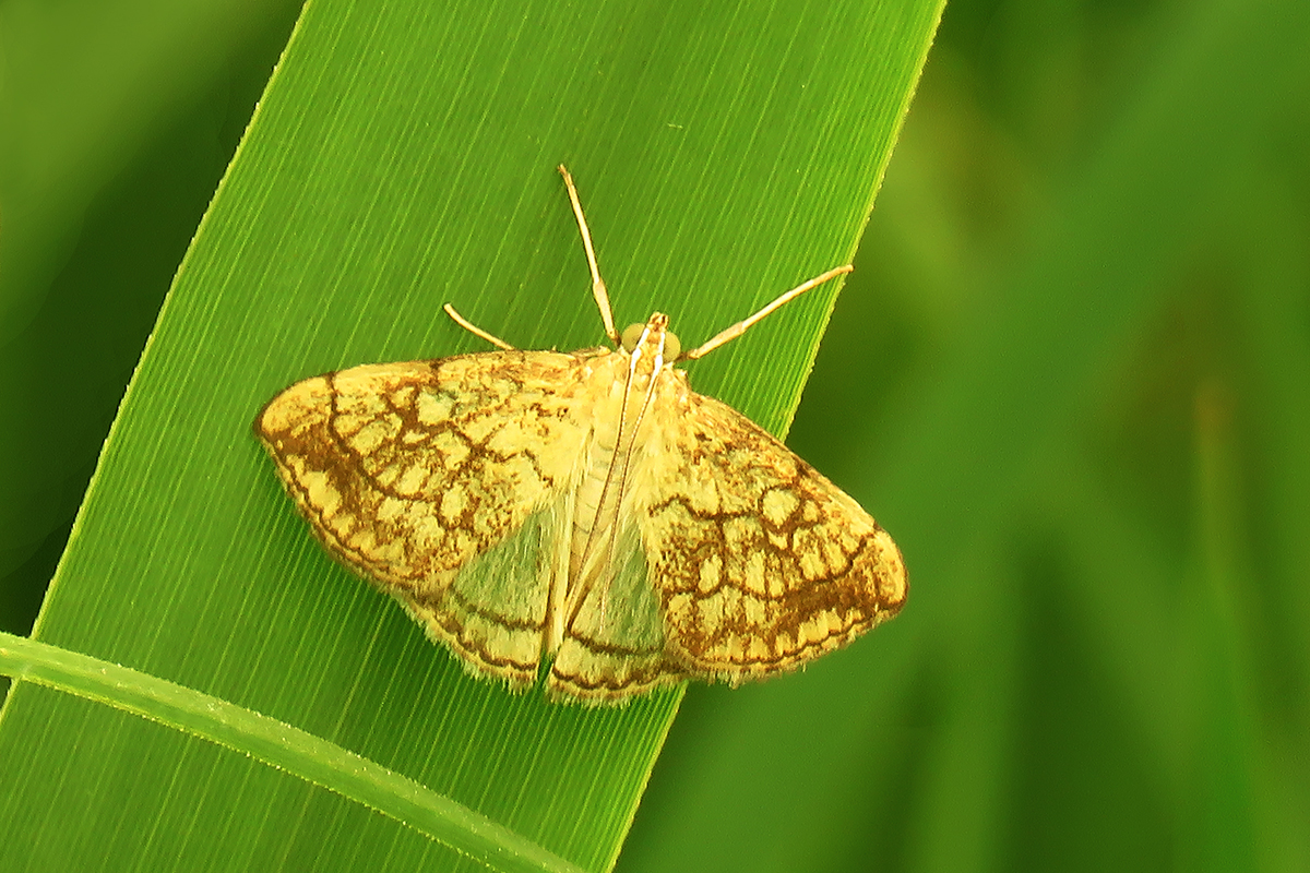 Malutki motyl z rodziny Crambidae – Wachlarzykowate , polska nazwa Rozcinka rukwianka , Żarnowiec 10.06.2020