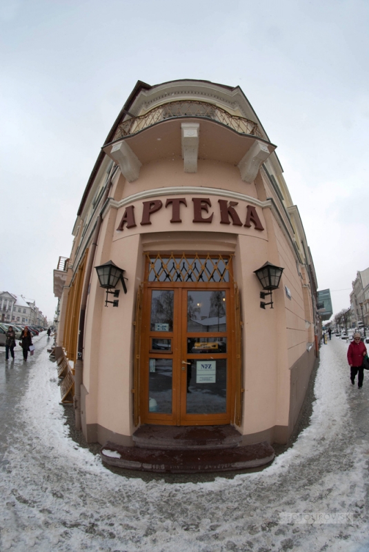 testowe Apteka 2 Poprzednio fotografowałem ten budynek Sigma 10 mm Parametry techniczne: Nikon D80 + Samyang 8 mm iso 200 Aparat: NIKON CORPORATION; Model: NIKON D80; Przysłona: f/8,0; Czas ekspozycji: 1/400 s; ISO: 200; Ogniskowa: 8 mm; © fot. Robert Lipowski data dodania: 12-03-2013