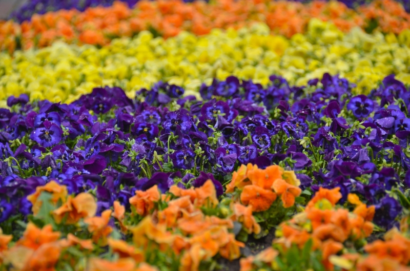 Rabata bratków w ogrodzie przy sanktuarium w Ludźmierzu. Słoneczny moment między jedną, a drugą burzą