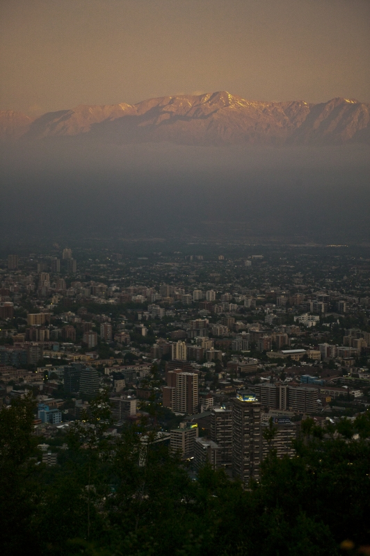 W Santiago de Chile juz zmrok i wieczorna mgła. W oddali widać oświetlone zachodzacym słońcem Andy