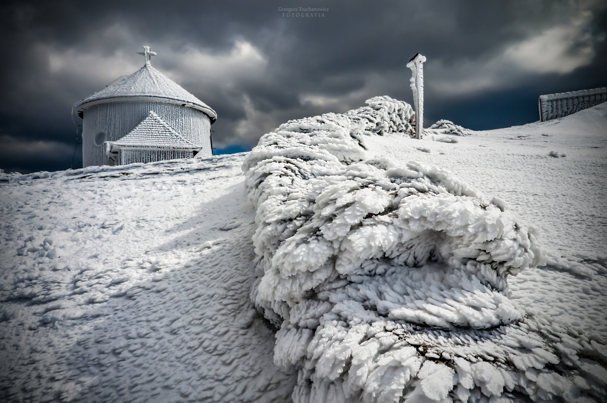 Karkonoski smok Najwyższy szczyt w Karkonoszach Śnieżka 1603 m npm w zimowej szacie. Parametry techniczne: f/16 czas 1/250s ISO-200 Nikon D-300 Aparat: NIKON CORPORATION; Model: NIKON D300; Przysłona: f/16,0; Czas ekspozycji: 1/250 s; ISO: 200; Ogniskowa: 18 mm; © fot. Grzegorz Truchanowicz data dodania: 28-11-2018