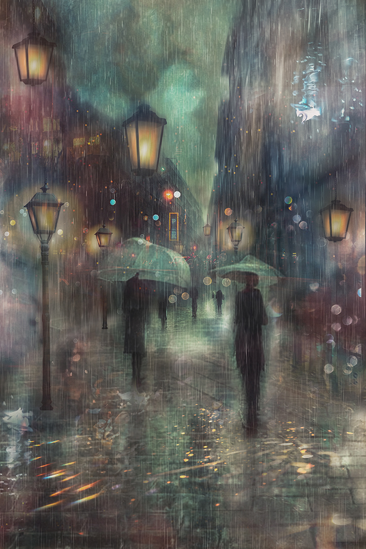 ciekawe podejście do tematu ulicy, deszczu, koloru i dynamicznej sceny z ludźmi w ruchu przechodniów jakby zamrożenie w świecie całkiem irracjonalnym jaki stwarza żywioł i światła oraz mrok wieczoru -przypomina to mnie sceny z obrazów wielu malarzy abstrakcjonistów -serdecznie pozdrawiam