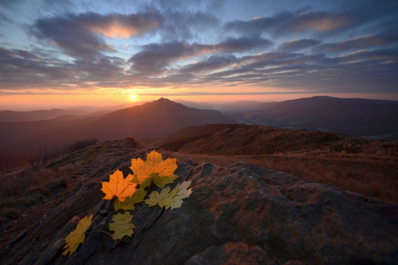 Wschód jest przepiękny. Kadr bardzo przemyślany. A 5 postawiłem, bo te liście (najprawdopodobniej ułożone) zaciemniają obraz i jego przekaz.Pozdrawiam i zazdroszczę miejsca i warunków.
