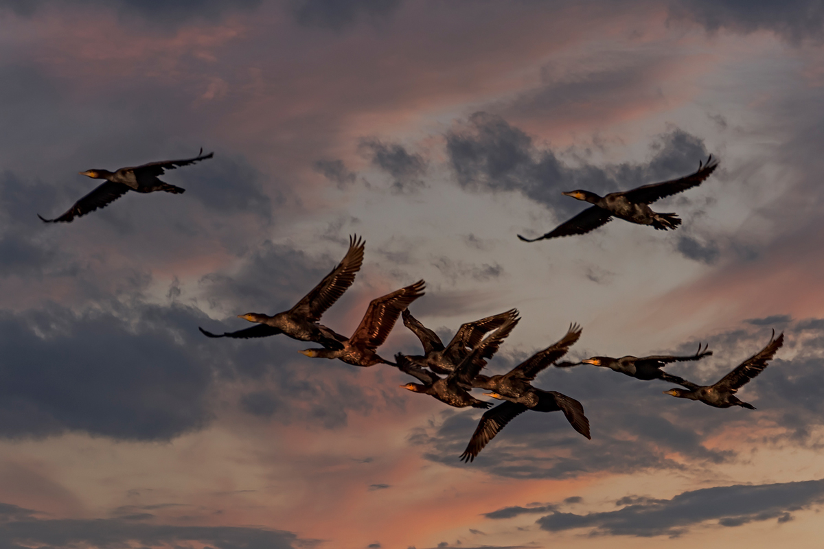 testowe Sznur kormoranów w locie splątał się... Parametry techniczne: Canon © fot. Joanna Zbróg data dodania: 04-10-2023