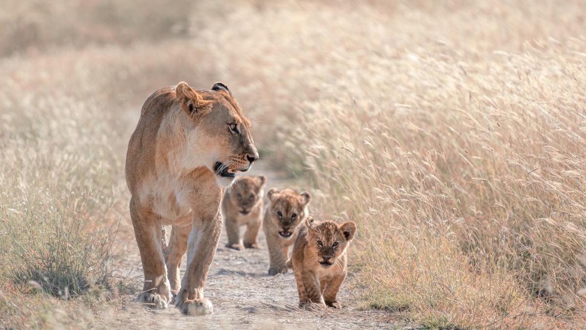 Pośród traw Serengeti Trójka paromiesięcznych kociąt przemierza pod opieką matki równiny Serengeti, porośnięte wysoką i suchą w lipcu trawą. Pod troskliwą opieką lwicy pozostaną nawet do ukończenia drugiego roku życia. To jest czas, w którym matka uczy swoje potomstwo polowania, obrony oraz innych umiejętności potrzebnych do przeżycia. W miarę jak młode stają się bardziej niezależne i zdolne do samodzielnego życia, stopniowo opuszczają grupę rodzinną. Parametry techniczne: Aparat: SONY; Model: ILCE-1; Przysłona: f/6,3; Czas ekspozycji: 1/2000 s; ISO: 640; Ogniskowa: 535 mm; © fot. Tomasz Szpila data dodania: 21-12-2023