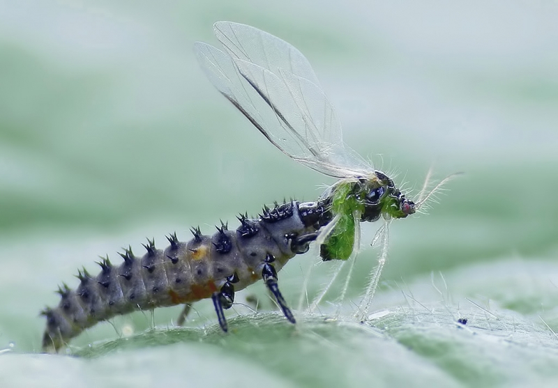 Larwa biedronki w trakcie posiłku Parametry techniczne: Aparat: NIKON; Model: COOLPIX P500 ; Przysłona: f/5,1; Czas ekspozycji: 1/80 s; ISO: 160; Ogniskowa: 42.4 mm; © fot. Iwona Sikorska data dodania: 06-06-2014