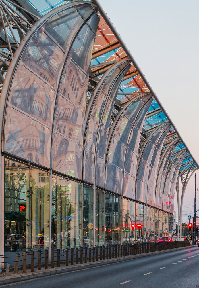 Łódź centrum o zmierzchu