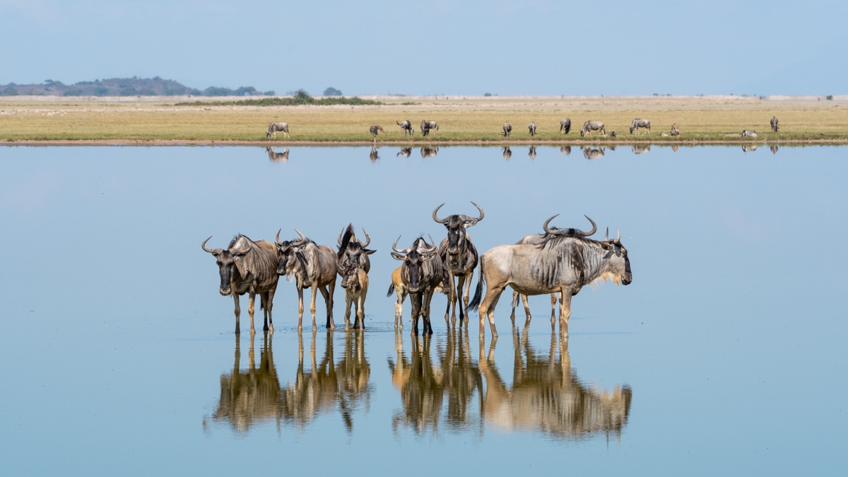 Zdjęcie rodzinne U podnóża najwyższej góry Afryki, Kilimandżaro położony jest Park Narodowy Amboseli. Na jego terenie znajdują się płytkie sadzawki, które w bezwietrzny dzień sprawiają wrażenie wielkich luster, w których odbija się niebo. W jednej z tych sadzawek do zdjęcia zapozowała niewielka grupka antylop Gnu. Parametry techniczne: Aparat: SONY; Model: ILCE-1; Przysłona: f/14,0; Czas ekspozycji: 1/800 s; ISO: 640; Ogniskowa: 227 mm; © fot. Tomasz Szpila data dodania: 24-10-2022