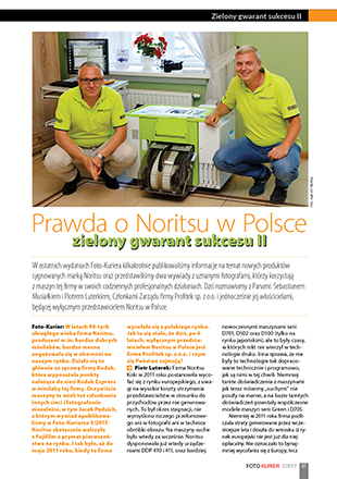 Foto-Kurier: W latach 90-tych ubiegłego wieku firma Noritsu, producent m.in. bardzo dobrych minilabów, bardzo mocno angażowała się w obecność na naszym rynku. Działo się to głównie za sprawą firmy Kodak, która wyposażała punkty należące do sieci Kodak Express w minilaby tej firmy. Oczywiście maszyny te mieli też członkowie innych sieci i fotografowie niezależni, w tym Jacek Pędzich, z którym wywiad opublikowaliśmy w Foto-Kurierze 3/2017. Noritsu skutecznie walczyło z Fujifilm o prymat pierwszeństwa na rynku. I tak było, aż do maja 2011 roku, kiedy to firma wycofała się z polskiego rynku. Jak to się stało, że dziś, po 6 latach, wyłącznym przedstawicielem Noritsu w Polsce jest firma Profitek sp. z o.o. i czym się Państwo zajmują? Piotr Luterek: Firma Noritsu Koki w 2011 roku postanowiła wycofać się z rynku europejskiego, z uwagi na wysokie koszty utrzymania przedstawicielstw w stosunku do przychodów przez nie generowanych. To był okres stagnacji, nie wymyślono niczego przełomowego ani w fotografii ani w technice obróbki obrazu. Na maszyny suche było wtedy za wcześnie. Noritsu dysponowała już wtedy urządzeniami DDP 410 i 411, oraz bardziej nowoczesnymi maszynami serii D701, D502 oraz D100 (tylko na rynku japońskim), ale to były czasy, w których nikt nie wierzył w technologie druku. Inna sprawa, że nie były to technologie tak dopracowane technicznie i programowo, jak są nimi w tej chwili. Niemniej tamte doświadczenia z maszynami jak teraz mówimy „suchymi” nie poszły na marne, a na bazie tamtych doświadczeń powstały współczesne modele maszyn serii Green i D705.