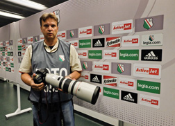 Zdjęcie wykonano aparatem Fujifilm X-M1 na stadionie Legii Warszawa przed meczem eliminacyjnym do Ligi Mistrzów: Legia Warszawa – The New Saints FC. Na zdjęciu, oprócz redaktora naczelnego, obiektyw Canon 200-400 mm f/4L IS USM EXT 1,4× (test str. 82). fot.: Robert Woźniak